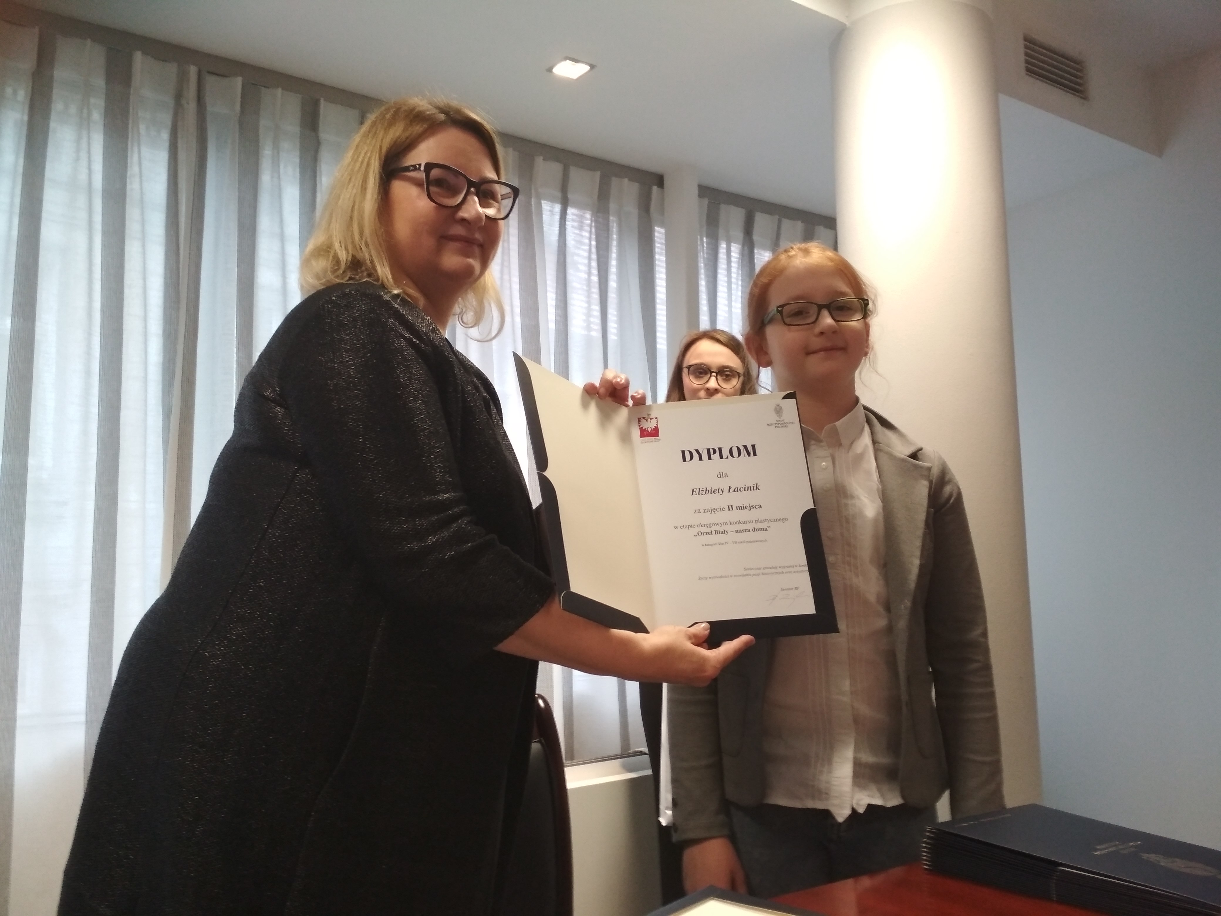 Uczennica klasy IV „d” Elżbieta Łacinik w poniedziałek 16 kwietnia odebrała w Siedzibie Biura Senatorskiego Barbary Zdrojewskiej nagrodę za zajęcie II miejsca w konkursie plastycznym „Orzeł Biały – nasza duma” w kategorii szkół podstawowych organizowanym przez Senat RP z okazji 100. rocznicy odzyskania przez Polskę niepodległości. Gratulujemy sukcesu!!!