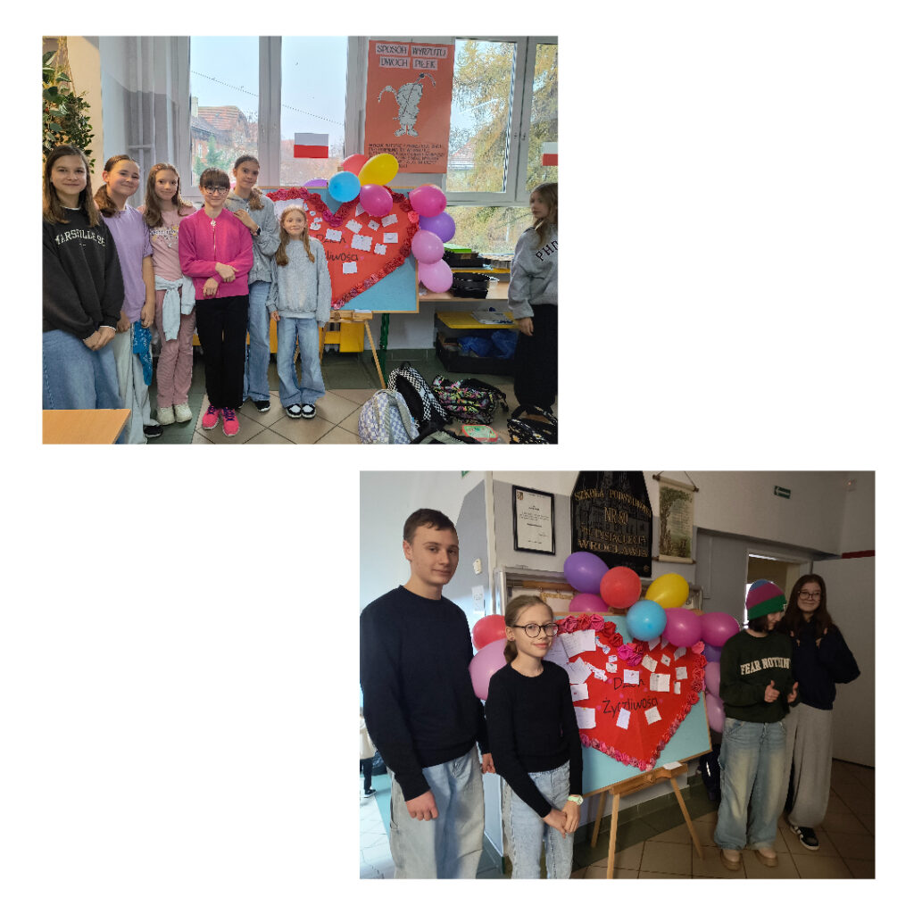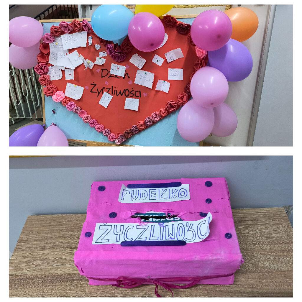 21 listopada w w klasach IV -VIII również obchodziliśmy Dzień Życzliwości – wyjątkowe święto przypominające, jak ważne są dobre słowa, gesty i uśmiech skierowane do drugiego człowieka. Z tej okazji Samorząd Uczniowski przygotował szereg miłych niespodzianek. Na szkolnym korytarzu pojawiło się wielkie serce ozdobione balonami i różami. Obok umieszczono „pudełko życzliwości”, do którego każdy – uczniowie, nauczyciele oraz wszyscy pracownicy