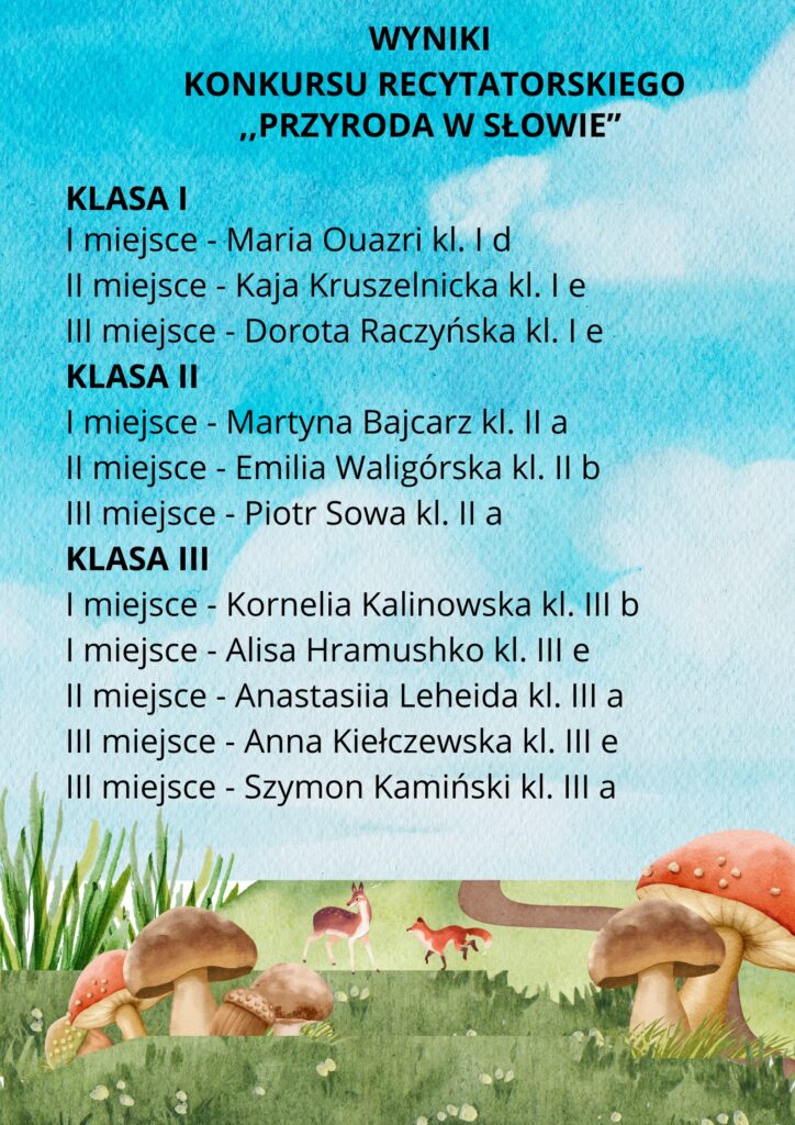 W dniach 03.12.2025 r. i 04.12.2025 r. odbył się konkurs recytatorski dla klas I-III. Tematem przewodnim w tym roku była ,,Przyroda w słowie”. W zaprezentowanych przez wykonawców wierszach „pachniało” przyrodą i „słychać” było śpiew ptaków. Oceniającym jak zawsze było trudno wyłonić zwycięzców, gdyż każdy włożył wiele wysiłku, by zaprezentować się jak najlepiej. Zwycięzcom gratulujemy!